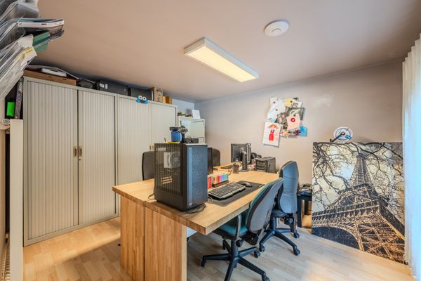 loods (150 m²): automatische poort (hoogte 4,2 m) - opslagruimte - toilet - aparte ruimte.