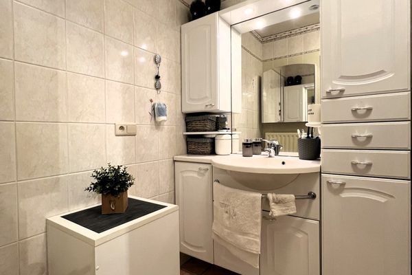 Indeling: inkom - gastentoilet - lichtrijke leefruimte met eetplaats en salon - geïnstalleerde keuken - berging met aansluiting wasmachine/droogkast - badkamer - 2 slaapkamers - 3 terrassen - gemeenschappelijke fietsenberging - overdekte parkeerplaats met garagepoort.
