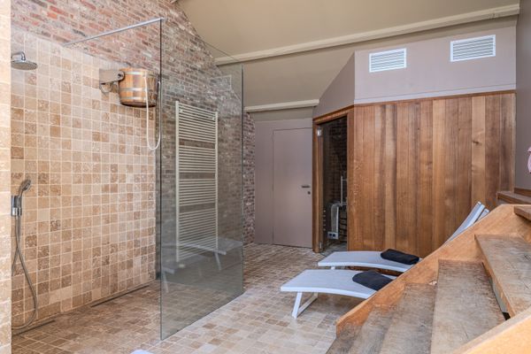 appartement (102 m²): leefruimte met open keuken - wellness met doucheruimte, sauna en jacuzzi - terras.