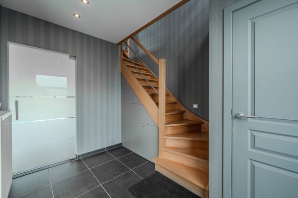 Indeling: inkom - gastentoilet - lichtrijke leefruimte met eetplaats en salon - geïnstalleerde keuken - kelder - bureau/slpk op het gelijkvloers - hal met ingemaakte kasten - badkamer met ligbad, douche en lavabomeubel - 2e badkamer met inloopdouche - 4 slaapkamers (15 m², 16 m², 11 m² en 11 m²) - apart toilet - zolder - zonnige tuin met aangelegd terras - tuinberging - garage met ingemaakte kasten en automatische poort.